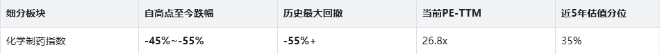 化学制药指数:自2021年高点至今跌幅 -45%~-55%,最大回撤 -55%+