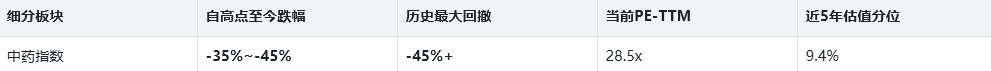 中药指数:自2021年高点至今跌幅 -35%~-45%,最大回撤 -45%+
