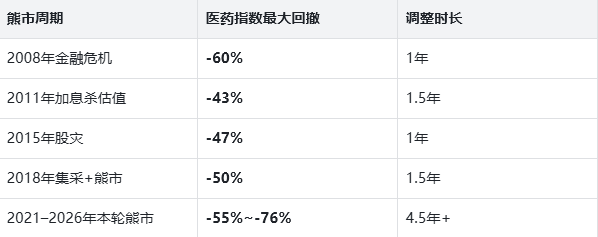 @最后遇到你 :无论纵向(跟自己比)横向(跟别人比)对比,本轮医药股调整都是A股历史上最长、最深的熊市,持续4–5年,远超历史平均3–4年的调整周期。