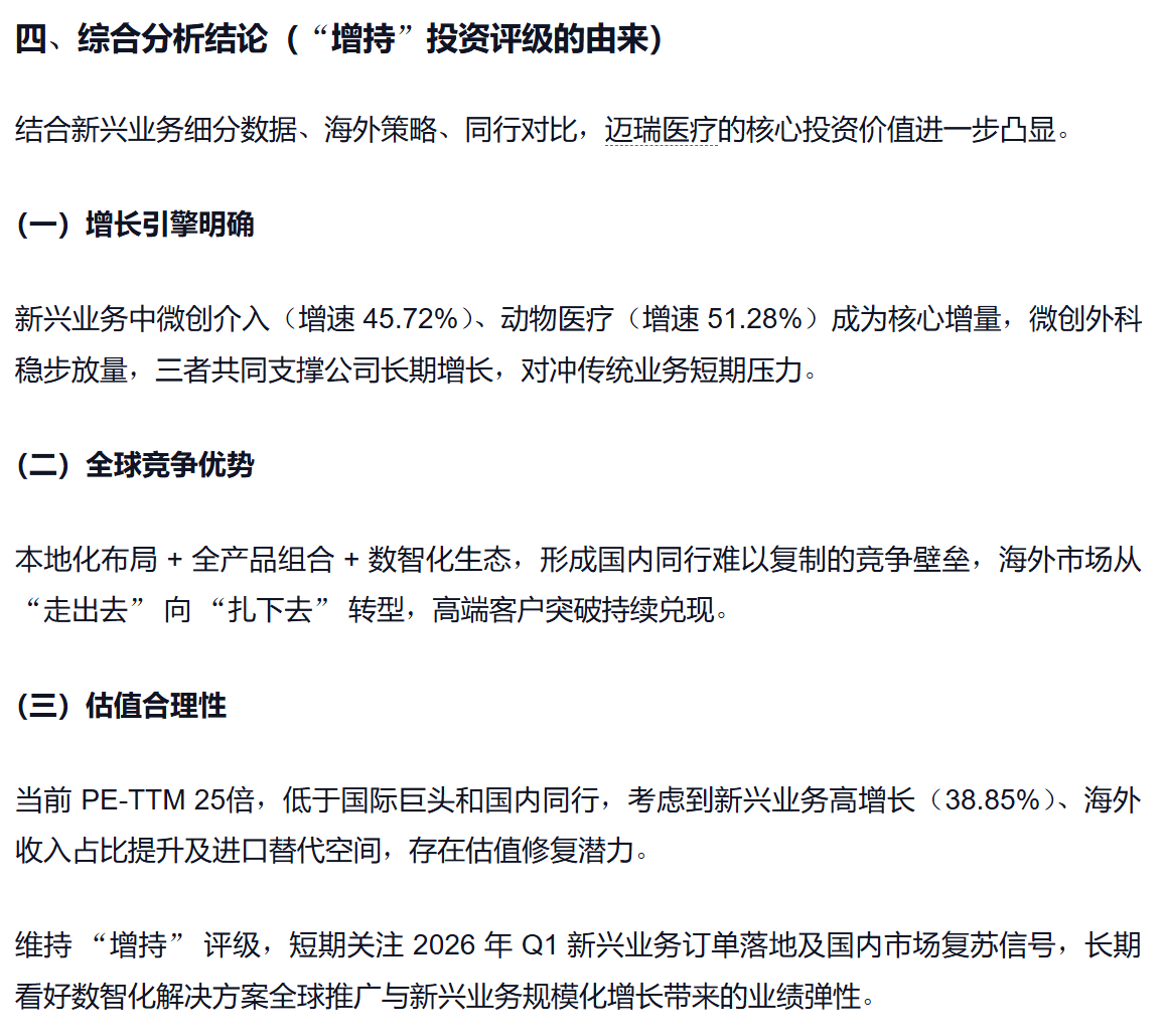 维持 “增持” 评级,短期关注 2026 年 Q1 新兴业务订单落地(尤其是电生理系统、动物医疗海外订单)及国内数智化方案装机量,长期看好微创介入 “全身介入” 拓展与数智化生态全球推广带来的业绩弹性。风险提示包括国内集采扩围超预期、海外地缘政治风险、技术迭代不及预期。