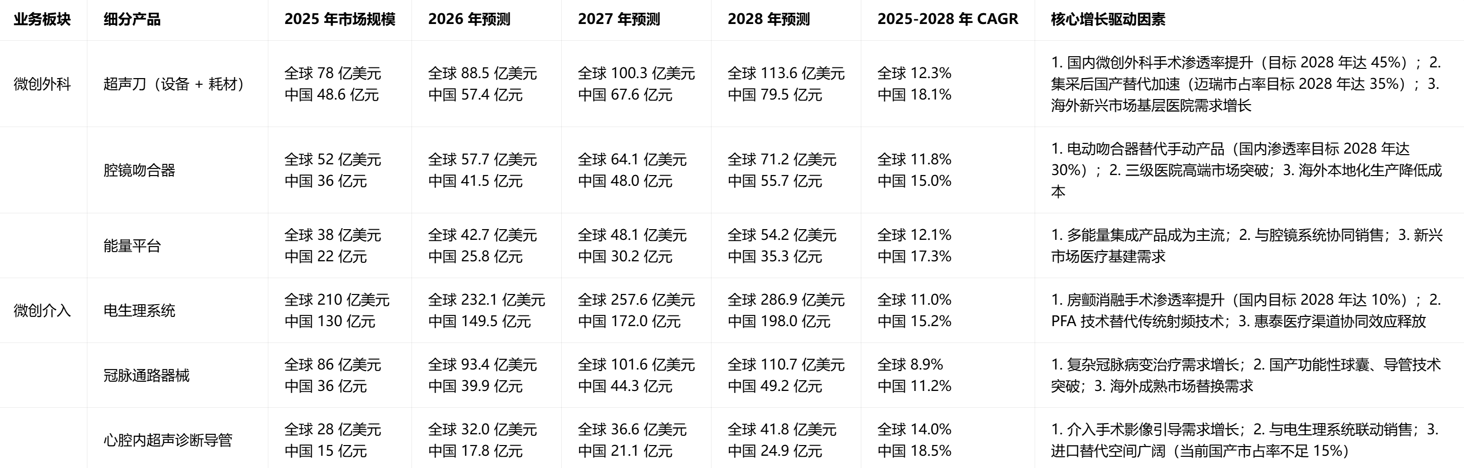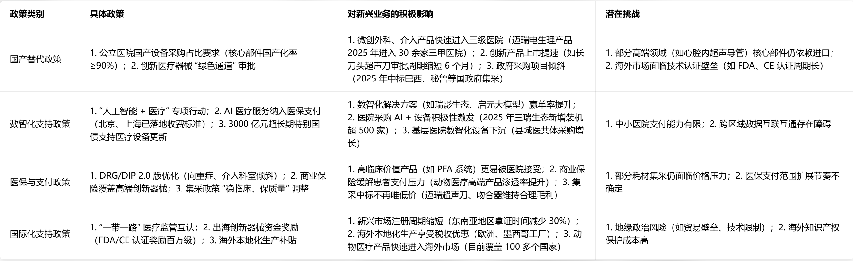 短期(1-2 年):国产替代、设备更新政策直接拉动需求,预计 2026 年国内新兴业务增速达 45% 以上,其中微创介入、微创外科受益于医院采购反弹;数智化政策推动 AI + 产品渗透率提升,成为赢单核心优势。