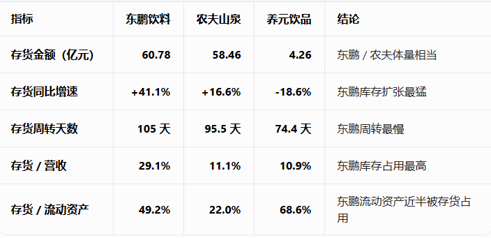 产成品:约 45 亿元(占 74%)→ 春节备货 + 新品铺货 原材料:约 10 亿元(占 16%)→ PET / 白砂糖战略储备 在产品 / 包装物:约 5.8 亿元(占 10%)