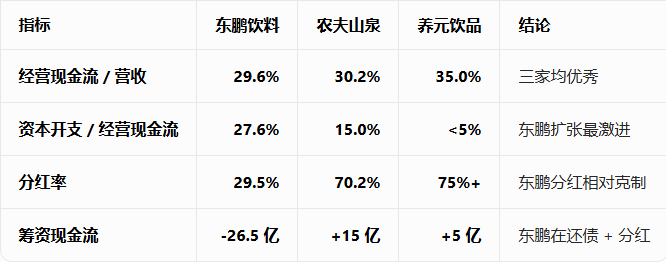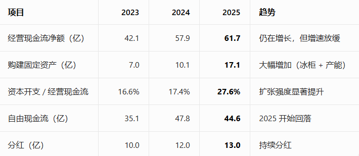 东鹏饮料2025年自由现金流约20.72 亿元(经营现金流 - 资本开支)→ 仍为正,但被高分红 / 还债消耗。
