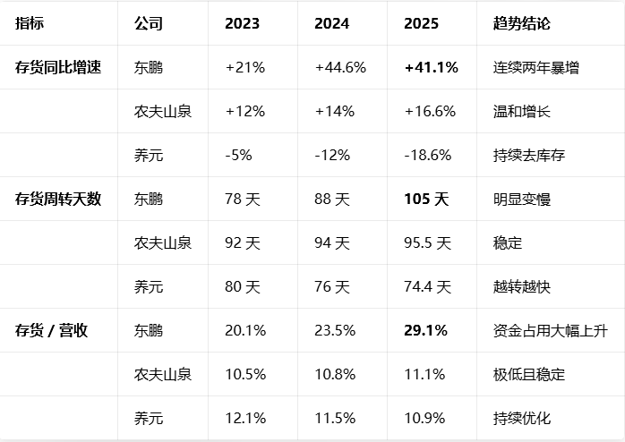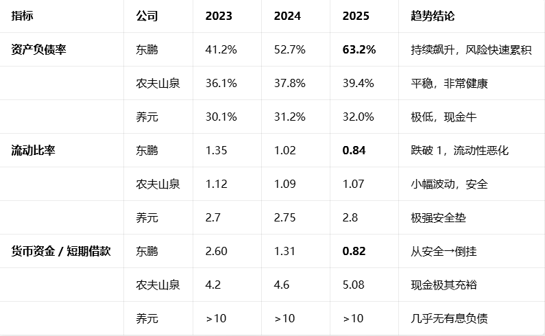这一篇紧接前文,把东鹏饮料 2025 年的存货结构、有息负债明细、现金流与资本开支做一份拆解,并与同行(农夫山泉、养元饮品)做库存与负债健康度对比,说说东鹏饮料近年是如何一步一步把自己作死的。