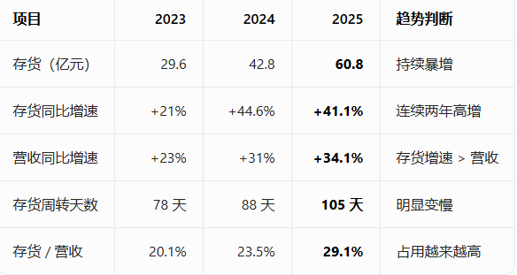 存货周转天数:105 天(2024:88 天)→ 库存效率下滑 存货 / 营收:29.1%(2024:23.5%)→ 库存占用上升