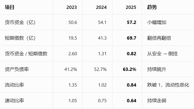 2025:存贷正式倒挂,流动比率 < 1→ 这是市场最害怕的信号:短期偿债压力显性化。