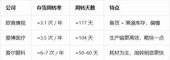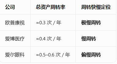 快周转公司标准:>1 次 / 年,三者全都远低于 1,全行业都是慢周转(这可能是眼科行业的特征),没有快周转选手。