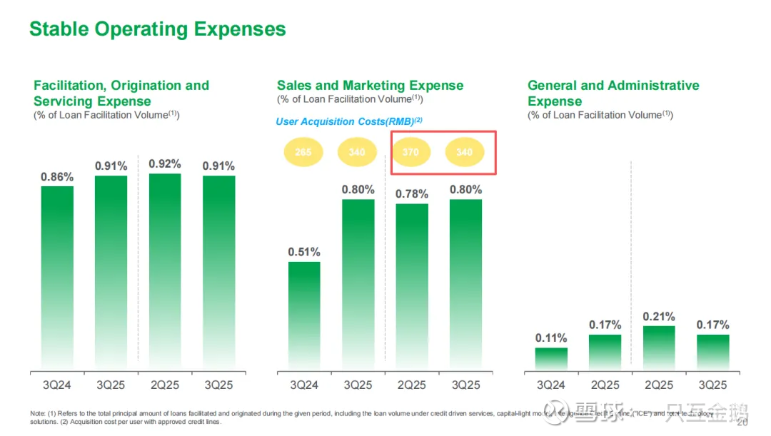 单看其三季度的获客成本,单个授信客户的获客成本为340元,较二季度的370元,减少8.11%。
