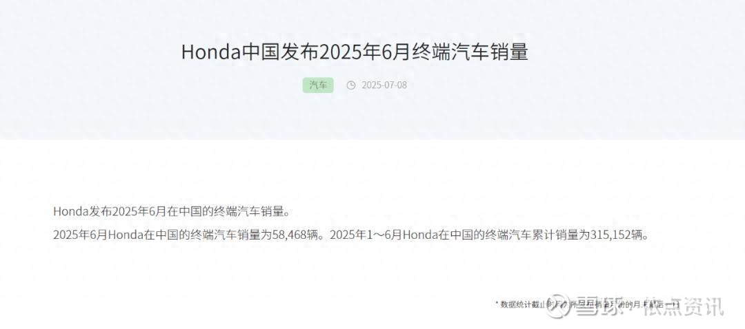 7月8日,本田中国发布最新销售数据显示,2025年6月在华终端销量为58468辆,同比下滑15.22%。1-6月累计销量315152辆,相较去年同期的415906辆下滑24.2%。