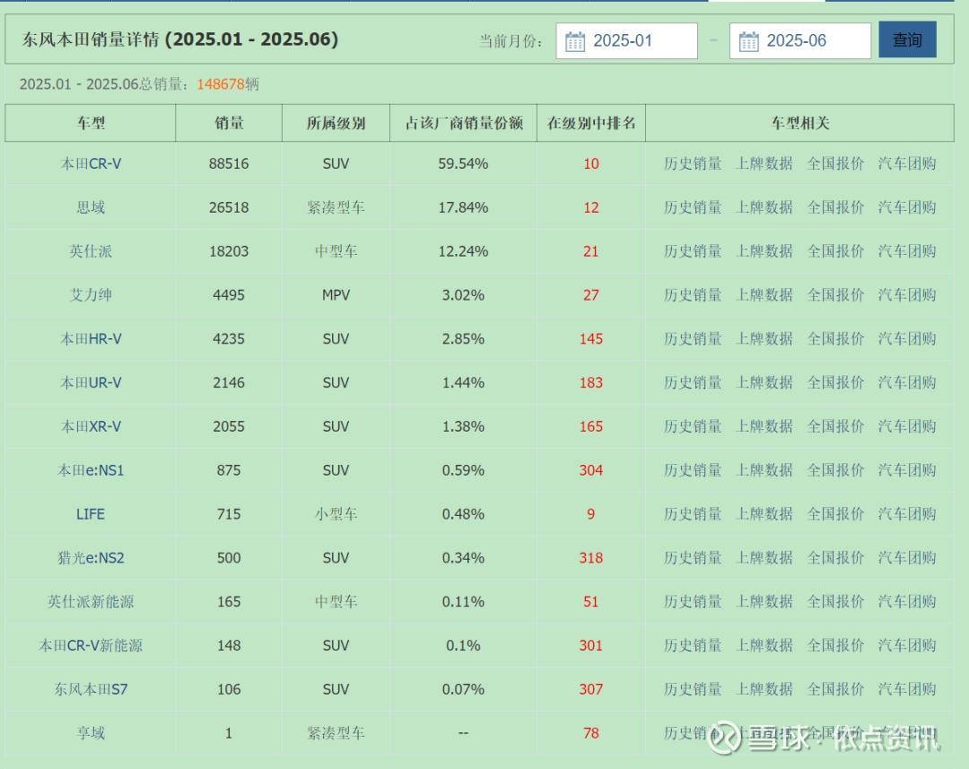 从东风汽车集团发布的产销快报来看,6月份东风本田的销量仅为27,045辆,同比下滑23.62%,自2025年以来已连续第6个月销量下滑 。