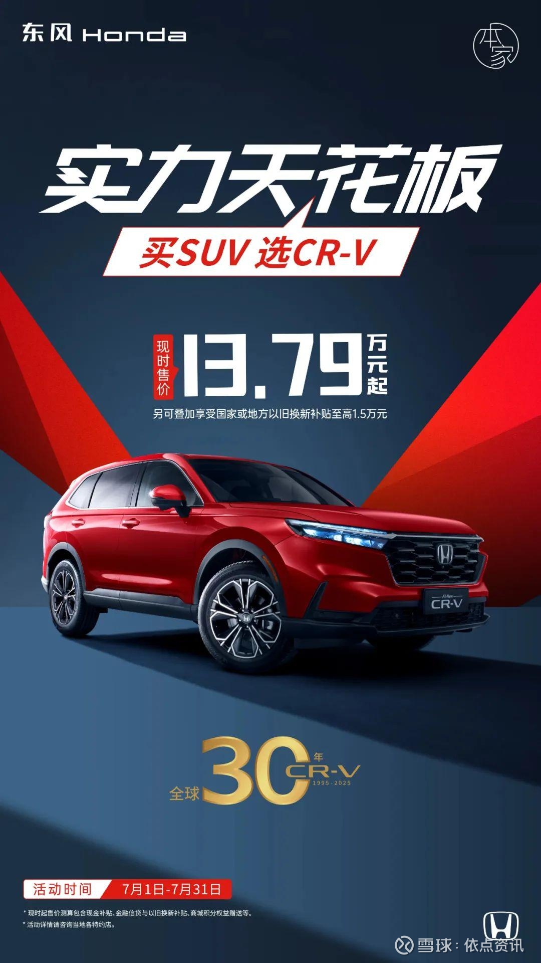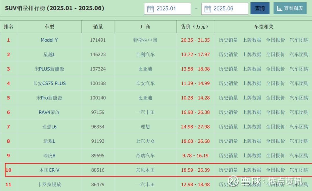 在燃油车领域,东风本田曾经的 “王牌车型” CR-V已经开始“风光不再”,尽管2025年上半年终端销量近9万辆,占到东风本田上半年销量的接近60%,但是统治力早已动摇,在上半年SUV销量排行中,名列第10位。
