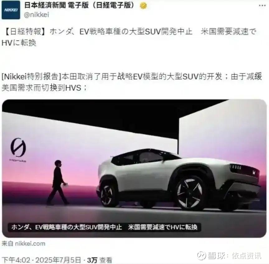据《日经亚洲》报道,受美国市场电动汽车需求持续走低以及美国政策变动影响,本田毅然决定终止一款原计划在 2027 年左右推出的大型电动 SUV 研发项目。