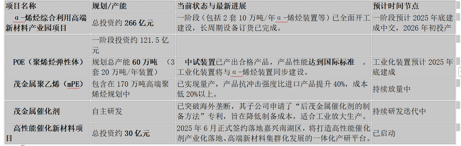 技术商业化与竞争风险:自研的α-烯烃、POE等技术尚未完全通过工业化验证,大规模量产存在不确定性。同时,万华化学等国内巨头也在布局同类高端产能,未来可能面临产能过剩和价格竞争。