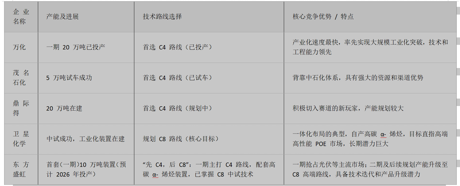 C4(1-丁烯):技术相对最成熟,是国内企业实现从0到1突破的首选。它能够生产出性能已远优于传统材料的POE,足以满足光伏、中低端改性塑料等领域的需求。