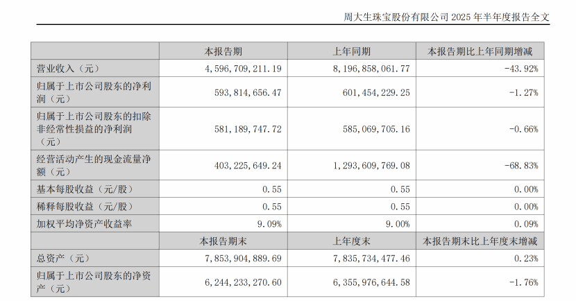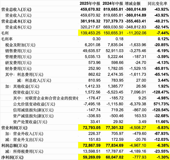 周大生发布的2025年半年报里,营业收入同比大幅度减少了43.92%,猛一看让人大惊失色,觉得这股完了。但继续往下看,归母净利润指下降了1.27%,是不是有一笔非常大的非经常性收益拉高了净利润?再往下一看扣非净利润下降得更少,指下降了0.66%。这就有点意思了,经常看到增收不增利的公司,却很少降到降收入不降利润的公司哎!下面把利润表拿出来掰开看看到底是咋回事。