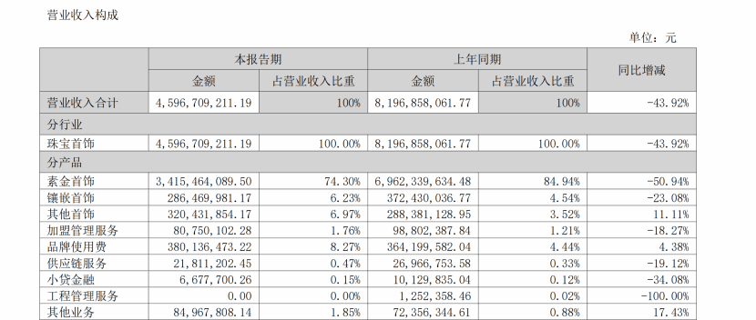 好了,总而言之,透过报表看生意的本质,大概就是周大生今年上半年的生意,比去年上半年下滑了百分之七左右。原因是金价太高,加盟商不太想进货了。这一切都挺正常的。