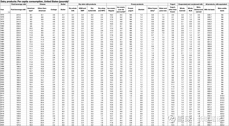 下面这个表,是美国农业部的数据。它包含了从1975年到2024年美国人均乳制品消费量和消费结构,包括了液体奶、奶酪、黄油、冰淇淋、奶粉等等。