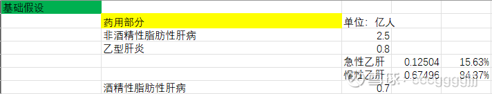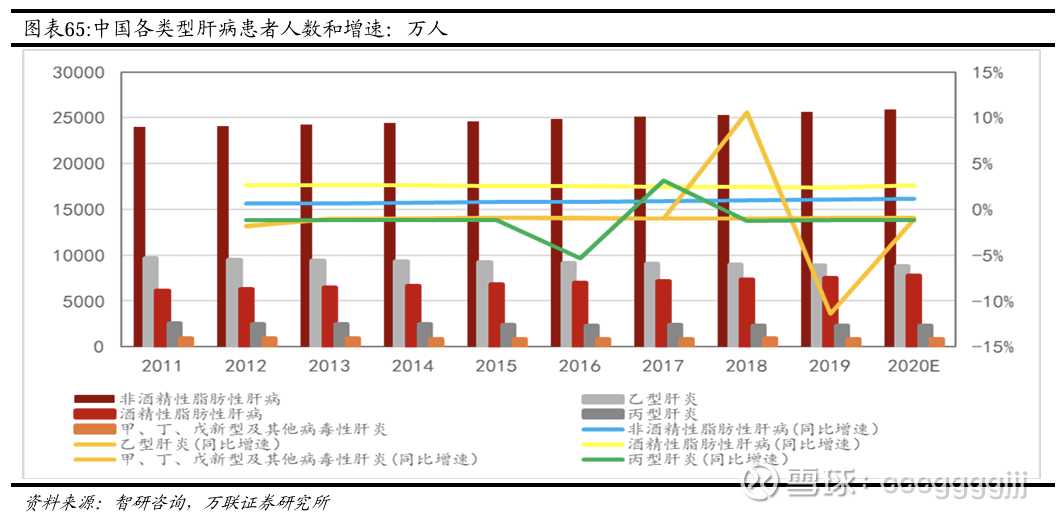 于是我们需要找到我国目前这四个疾病分别的人数是多少,根据万联证券的统计,2019年,我国非酒精性脂肪性肝病患者2.5亿,酒精性脂肪性肝病0.7亿,乙肝0.85亿。