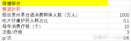 来到保健部分,保健部分主要为解酒护肝,肝火旺等由于不好量化先不计算,但个人认为肝火旺也是一块很大的市场需求。自购解酒护肝:这部分人群主要购买以自用,假设消费群体主要为贵州茅台酒消费群体中的一部分;假设每人每次消费茅台酒150g,每年消费10次;片仔癀服用方式为0.6g/次,饮酒前或饮酒后服用一次,第二天再服用1次。