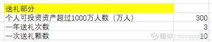 然后就是送礼部分,假设送礼人群主要为个人可投资资产超过1000万的人群,每人送礼的时候一次性送10粒。这里估计人群大概是300万。
