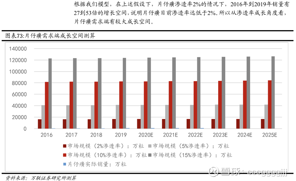 以上就是关键的基本假设变量,具体计算过程就省去了。最后设定渗透率2%,5%,10%,15%这四个数,得出在不同渗透率情况下片仔癀的需求是多少万颗。