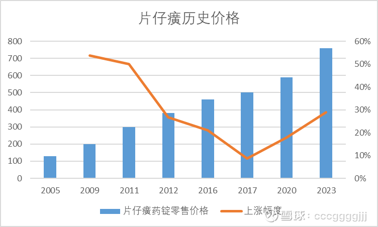 由于估算模型的粗糙,以及假设数据的不同,最后估算结果差异较大也正常,但是从结果来看,有一点是可以肯定的,片仔癀的渗透率还非常之低。根据生活中的调研,身边的同学朋友亲戚知道片仔癀的非常之少,远远没有同仁堂,东阿阿胶的品牌知名度,所以可以说知名度的提升方面还是星辰大海。光从量上看,都还有非常巨大的成长空间,只要原材料跟得上,渗透率到达2%,量增长就有10倍,更何况长期来看还有价的提升。如下图,2005年至今价格的CAGR达到了9.23%,未来的价格会如何呢,个人认为长期来看,价格的设定,最起码要保持75%以上的毛利率。对于经常消费片仔癀的人群来说,吃一颗700和吃一颗1000又有什么很大区别呢,老年人什么都可以不要,唯独身体健康必须得要。
