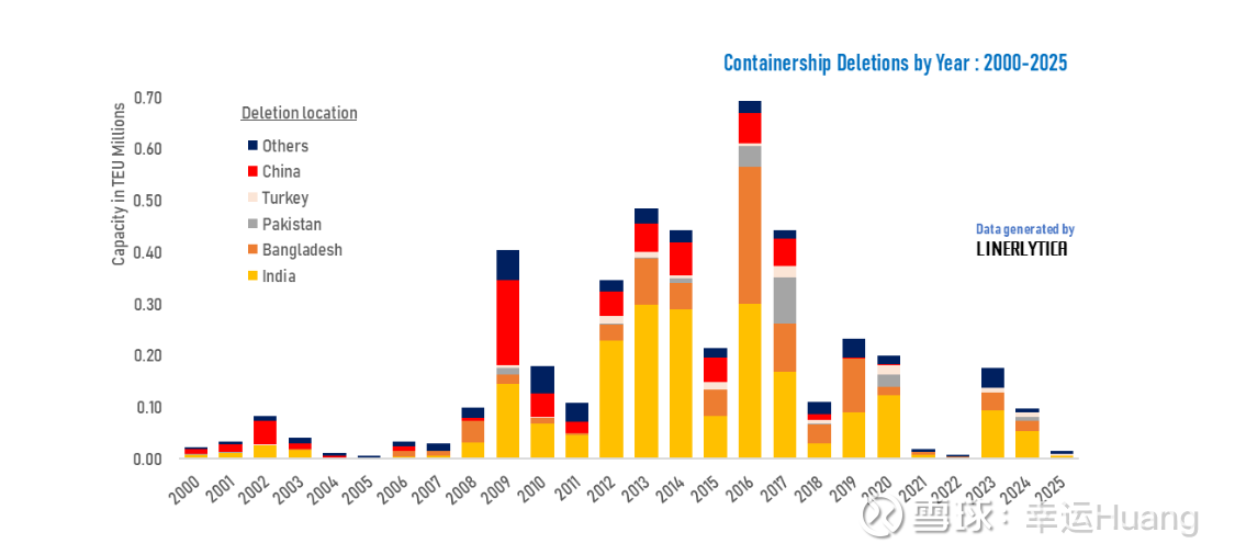 今年截至目前,仅 12 艘总运力为 8,465 标准箱的集装箱船被拆解,另有 6 艘船舶因海上失事或改装为其他用途而退出市场。尽管今年迄今记录的船舶注销量处于较低水平,但更大的挑战仍在前方:由于船舶订单量正迅速激增,需通过大幅增加拆船量来实现平衡 —— 到 2030 年(2005年开始的那波造船潮开始进入20船龄),至少需拆解 450 万标准箱的运力,这一规模相当于过去 25 年累计拆解的运力总量。