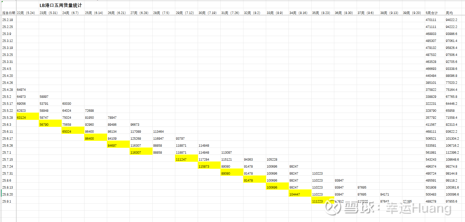 LA 2508月货量继续爆量严重,基本肯定超过50万TEU,跟7月货量会差不多,历史最高单月货量附近。9月份货量如期下滑预计会在40万以上,接下去是看301船舶停靠法案的变数了。