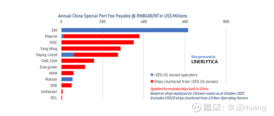中国此次特别港口费的覆盖范围远超最初预期,不仅包括美国持股超 25% 的企业(例如以星航运 / Zim),还涵盖从非运营船东(如 Seaspan(赛斯潘)、SFL、Navios(纳维奥斯)、Costamare(科斯塔马雷)、Global Ship Lease(全球船舶租赁公司)等)租赁的船舶。