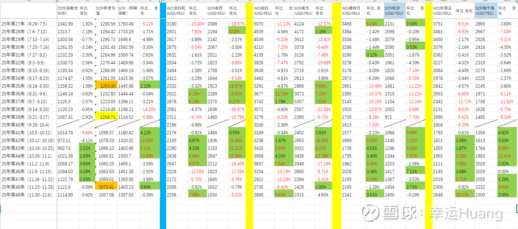 (注意表中CCFI季度均值橙色之前是前推一个月均值,黄色为当季均值,本周开始切换成10月至今均值计算)