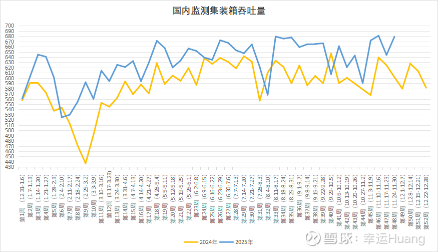 全国重点港口上周的集装箱吞吐量(第48周,每周一更新)环比微降0.27%至677万TEU依然处在历史最高位附近。