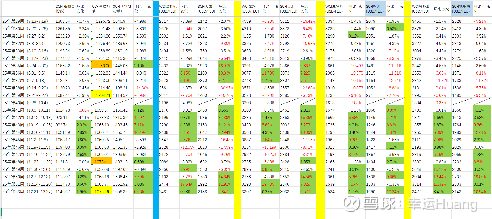 (注意表中CCFI季度均值橙色之前是前推一个月均值,黄色为当季均值,12月开始切换成10月至今均值计算)