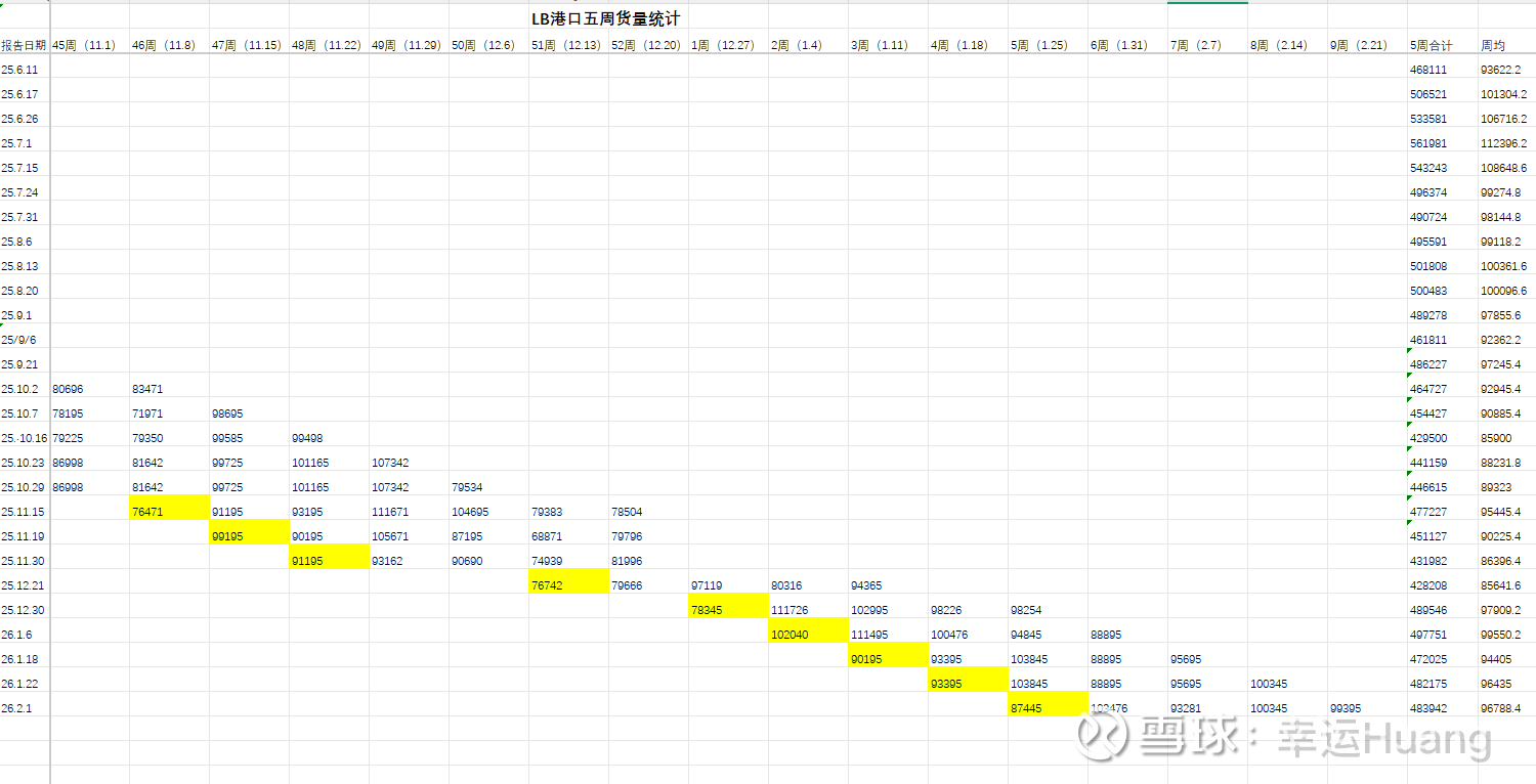 LA 2601月货量环比继续略有回升,大概在43.5-45.5万TEU。2月货量目前看肯定也在40万TEU之上继续环比回升。同比去年2月41.3万的同比转正(今年过年较晚)。