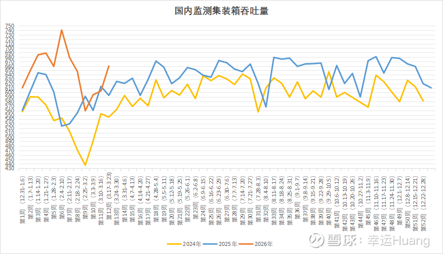 全国重点港口上周的集装箱吞吐量(第10周,每周一更新)环比继续回升9.27%至659.8万TEU.节后货量恢复速度正常。