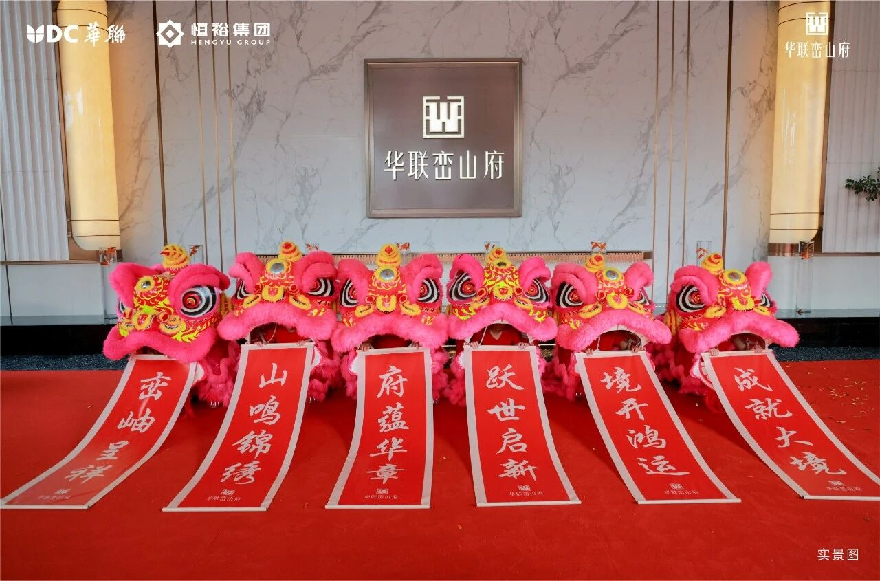 醒狮点睛与采青环节将现场氛围推向高潮,灵动的醒狮跃动生风,领导们执笔点睛,寓意“点石成金、吉祥如意”,象征着项目未来发展势如破竹,赢得阵阵掌声。紧接着,领导与嘉宾共同移步剪彩区,伴随着漫天金花,华联峦山府展示中心正式开门迎客。