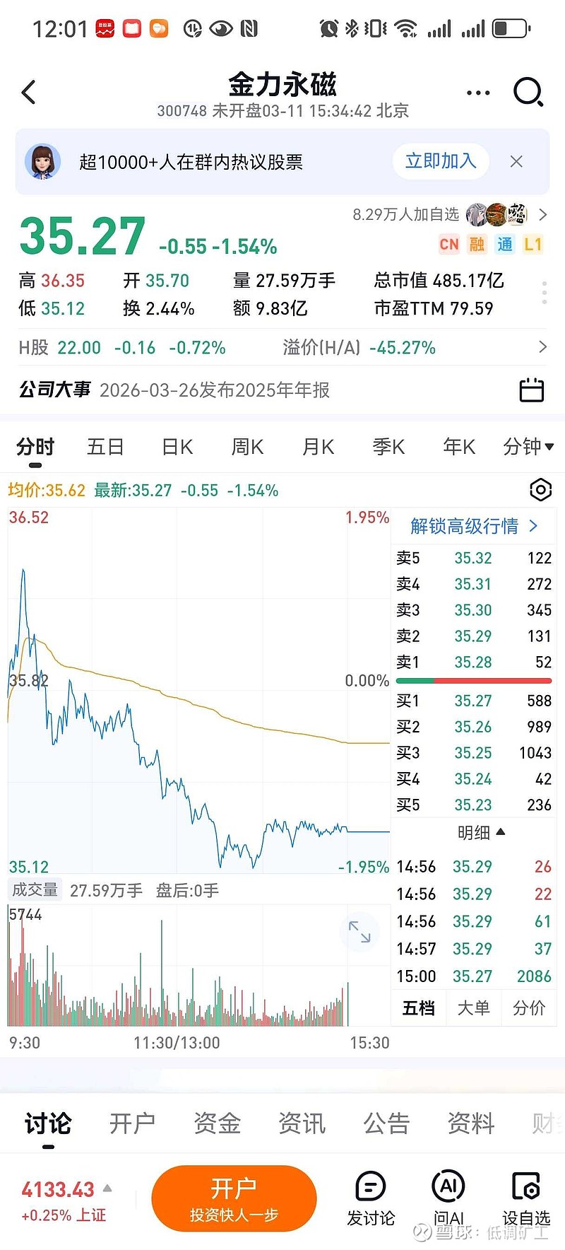 金力永磁当日股价下跌1.54%,收于35.27元,而