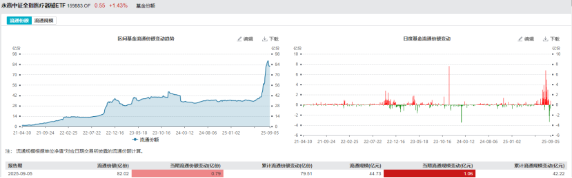 截止午间收盘,$医疗器械ETF(SZ159883)$ 收涨3.48%,日K上移明显!拉长时间看,规模方面,医疗器械ETF持续获得资金注入,截止9月5日,其流通份额突破82亿份,流通规模达到44.73亿元,实现显著增长,新增规模位居可比基金1/4。