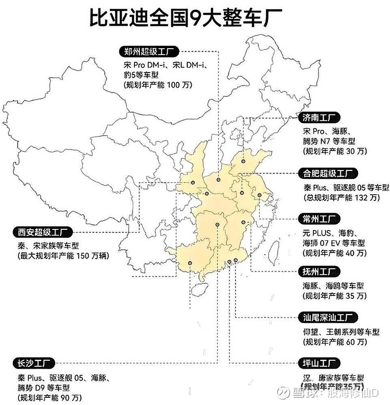 9. 襄阳基地:产能规划30万辆/年,2023年投产,生产秦PLUS DM-i、元PLUS、海狮07 EV等车型。