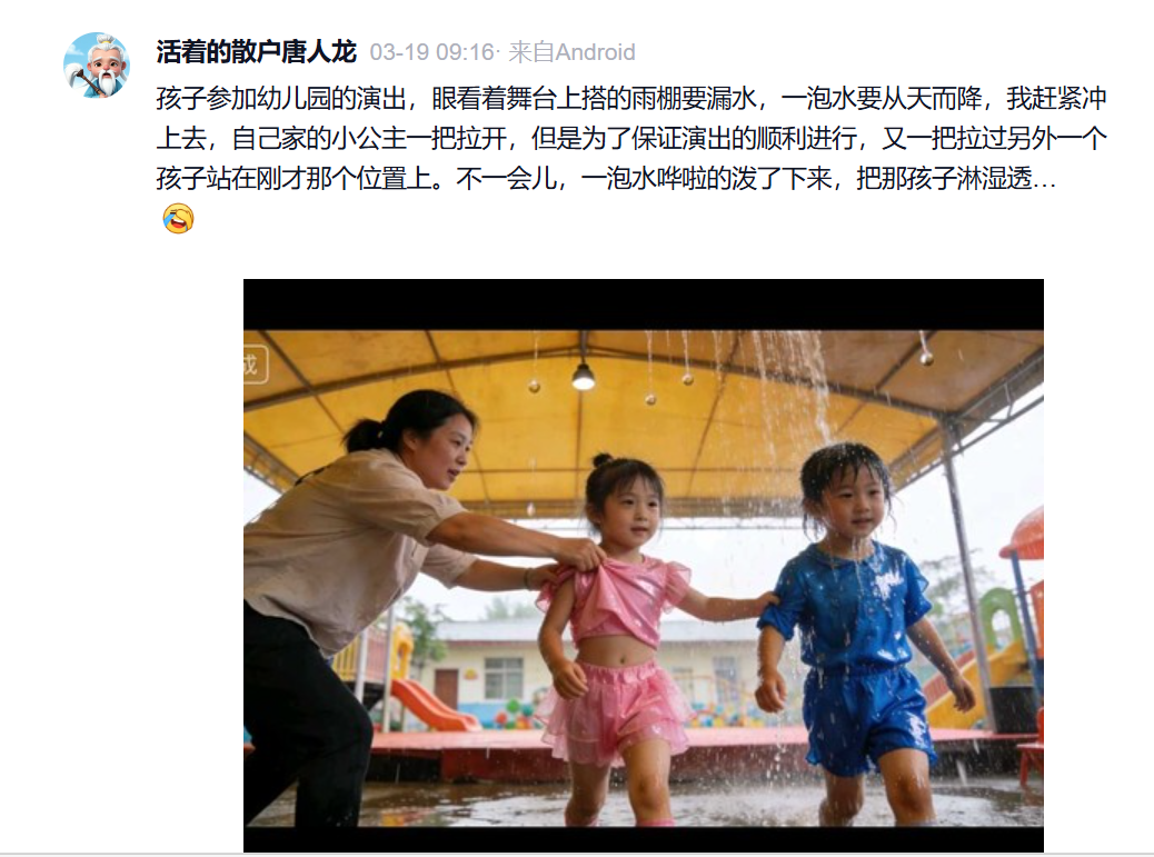 孩子参加幼儿园的演出,眼看着舞台上搭的雨棚要漏水,一泡水要从天而降,我赶紧冲上去,自己家的小公主一把拉开,但是为了保证演出的顺利进行,又一把拉过另外一个孩子站在刚才那个位置上。不一会儿,一泡水哗啦的泼了下来,把那孩子淋湿透…