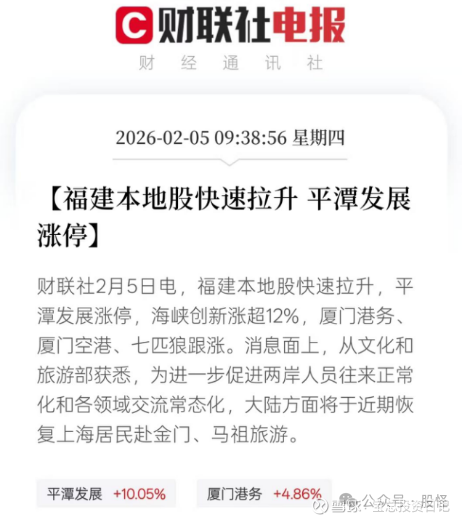 平潭发展是平潭综合实验区唯一 A 股上市平台,近期因封关倒计时 + 两岸融合加速 + 福建自贸区升级三大政策共振成为市场焦点,2 月5日强势涨停,主力资金净流入12.78 亿元。但公司基本面与估值严重背离,2025 年预亏6500 万- 1.3 亿元,新业务尚未贡献规模收入,短期是典型的政策概念股,适合短线博弈,不适合长期价值投资。