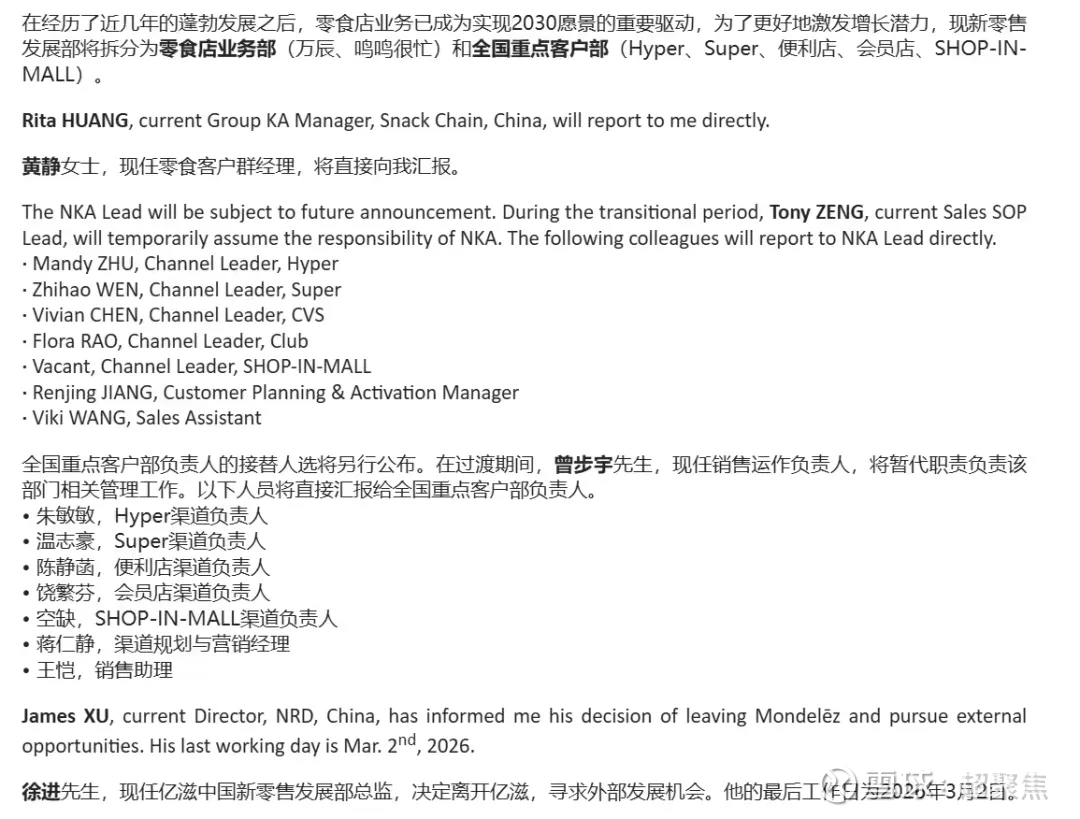 公司宣布将原新零售发展部拆分为独立的"零食店业务部"和"全国重点客户部"。原总监徐进已离职,现任销售运作负责人、前玛氏高管曾步宇暂代全国重点客户部职责。