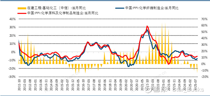2025年Q1,基础化工板块在建工程由正转负,周期拐点开始显现。我们参考2015年的周期,2025年7月基础化工板块在建工程由正转负,同期化学原料&制品、化学纤维板块PPI同比探底回升,2016年8月PPI开始由负转正,如果参考化工产品价格指数,2016年2月化工品价格即探底反转。参考上一轮周期,2026年或许是化工价格回暖的拐点。但值得注意的是,尽管在建工程增速转负,但固定资产仍在投产转固,中短期供给压力仍存,静待供需端的潜在变化。