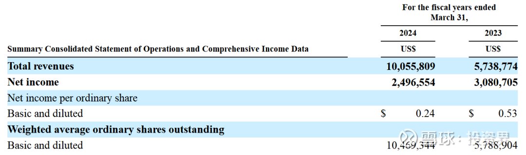 具体来看,2023财年和2024财年(截至3月31日),华通证券营收分别为574万美元(约合4100万人民币)、1005.58万美元(约合7200万人民币),同比增长75.2%,相应的净利润分别为308万美元(约合2200万人民币)、250万美元(约合1800万人民币)。
