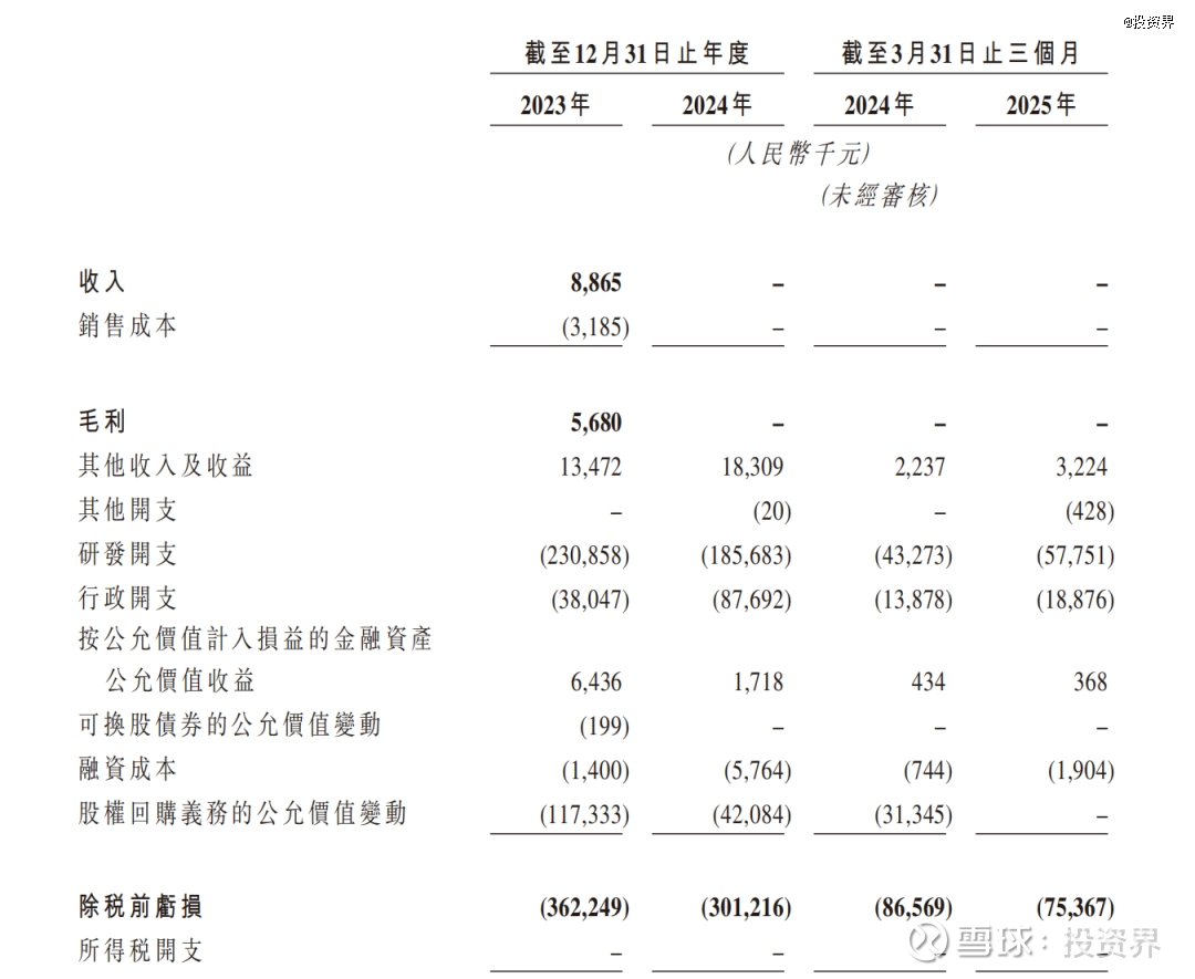 财务数据显示,维立志博仅在2023年实现收入886.5万元。2023年、2024年及2025年前三个月,公司净亏损分别为3.62亿元、3.01亿元和7536.7万元。同期,公司研发开支分别为2.31亿元、1.86亿元、5775.1万元,高额的研发投入是亏损的主要原因之一。