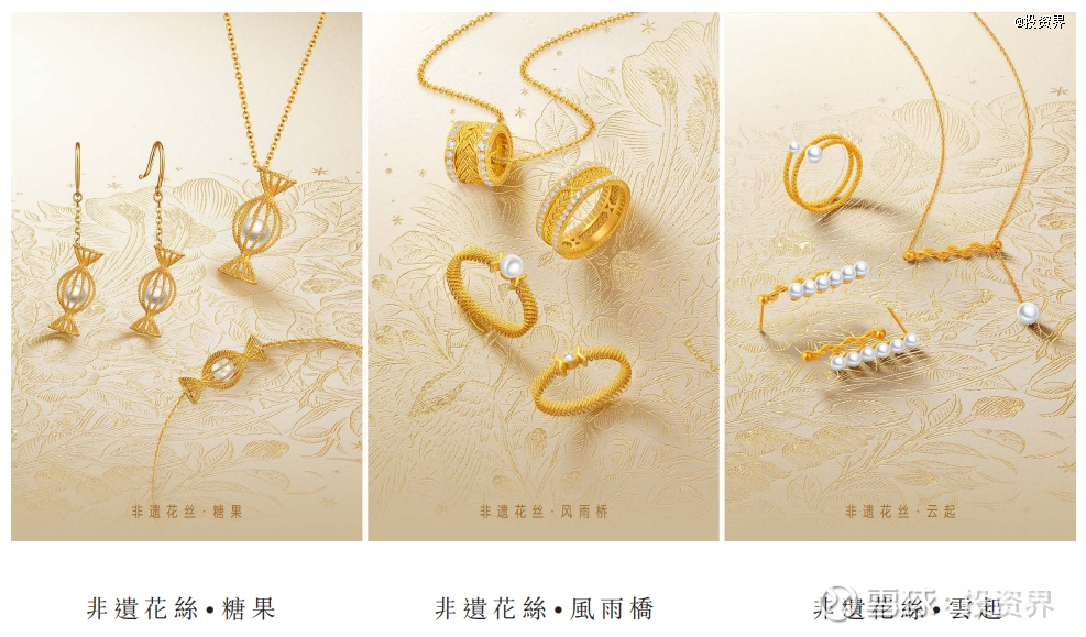 聚焦在产品上,潮宏基推出高级黄金珠宝系列、黃金串珠系列、卡通IP联名系列、K金系列等,其中,高级黄金珠宝系列借助传统工艺与非遗文化打造,与老铺黄金有着不少相似之处。