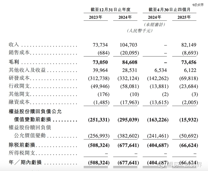 不过,生物医药企业普遍面临研发周期长、前期投入重的特点,短期内难以盈利。劲方医药在2023年、2024年及2025年前四个月分别实现营业收入0.74亿元、1.05亿元和0.82亿元;同期研发开支分别为3.13亿元、3.32亿元和0.698亿元;净亏损分别为5.08亿元、6.78亿元和0.66亿元。对此劲方医药表示,开发优质在研药物需要长期大量的财务资源投资,而公司战略核心将继续在该领域进行持续投资。