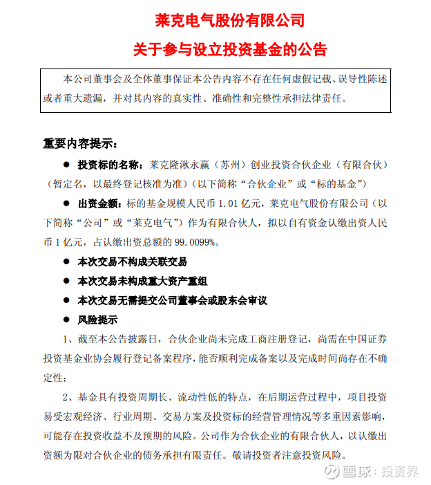 投资界消息,2月28日,莱克电气发布公告,称公司与普通合伙人苏州隆湫私募基金管理有限公司签署了 《莱克隆湫永赢 (苏州)创业投资合伙企业(有限合伙)合伙协议》。根据公告,合伙企业募集资金总规模拟为人民币 1.01 亿元,其中莱克电气作为有限合伙人以自有资金认缴出资人民币 1 亿元,占认缴出资总额的 99.0099%。标的基金重点投资高端装备制造等领域的企业。
