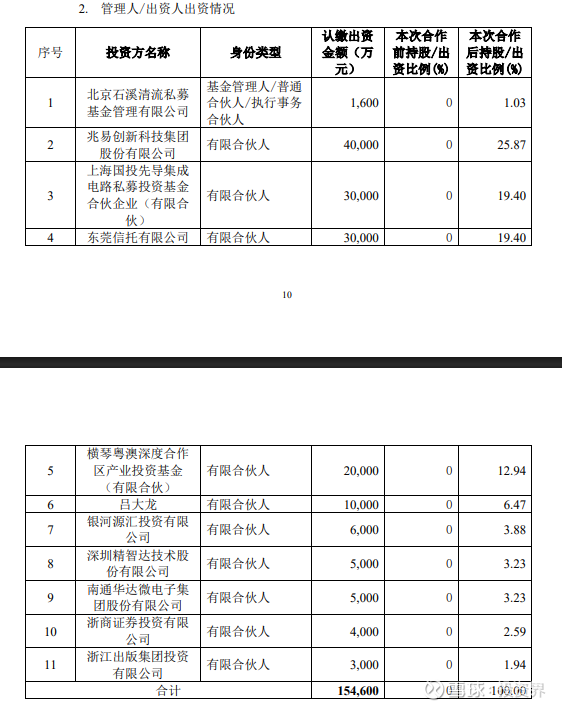 基金管理人为北京石溪清流私募基金管理有限公司,与兆易创新及其控股股东、董监高无关联关系或利益安排。其他有限合伙人包括上海国投先导集成电路私募投资基金、东莞信托、横琴粤澳深度合作区产业投资基金、吕大龙、银河源汇投资、深圳精智达、南通华达微电子、浙商证券、浙江出版集团投资等机构及自然人,构成多元化出资结构。