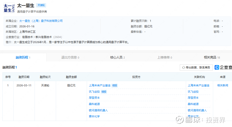 投资界3月11日消息,中性原子量子计算企业太一量生(上海)量子科技有限公司(下称“太一量生”)近日完成超亿元天使轮融资。本轮融资由上海未来产业基金和科大讯飞旗下CVC讯飞创投联合领投,晶科能源控股、银河通用、雅本化学等产业方及厚雪投资等多家知名市场化投资机构跟投。资金将主要用于产品研发、团队扩张以及公司首台量子计算机的研制搭建。