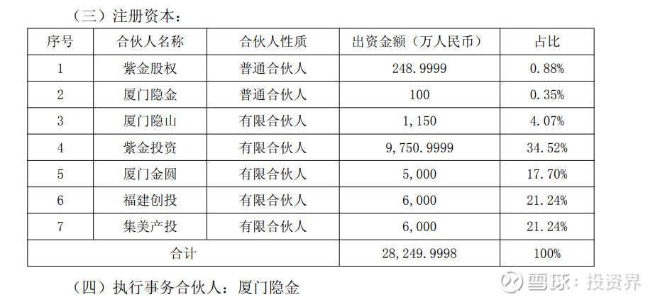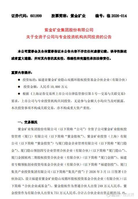 投资界消息,3月13日,紫金矿业公告,其全资子公司紫金矿业股权投资管理(厦门)有限公司(以下简称“紫金股权”)、紫金矿业投资(上海)有限公司(以下简称“紫金投资”)与厦门隐金企业管理有限公司(以下简称“厦门隐金”)、厦门隐山领创四号企业管理合伙企业(有限合伙)(以下简称“厦门隐山”)、厦门金圆展鸿二期股权投资合伙企业(有限合伙)(以下简称“厦门金圆”)、福建省专精领航创业投资母基金合伙企业(有限合伙)(以下简称“福建创投”)、厦门集美产业投资集团有限公司(以下简称“集美产投”)于2026 年3 月11 日签署《合伙协议》,设立福建省紫金矿业隐山双循环股权投资基金合伙企业(有限合伙)(下称“紫金隐山双循环基金”)。